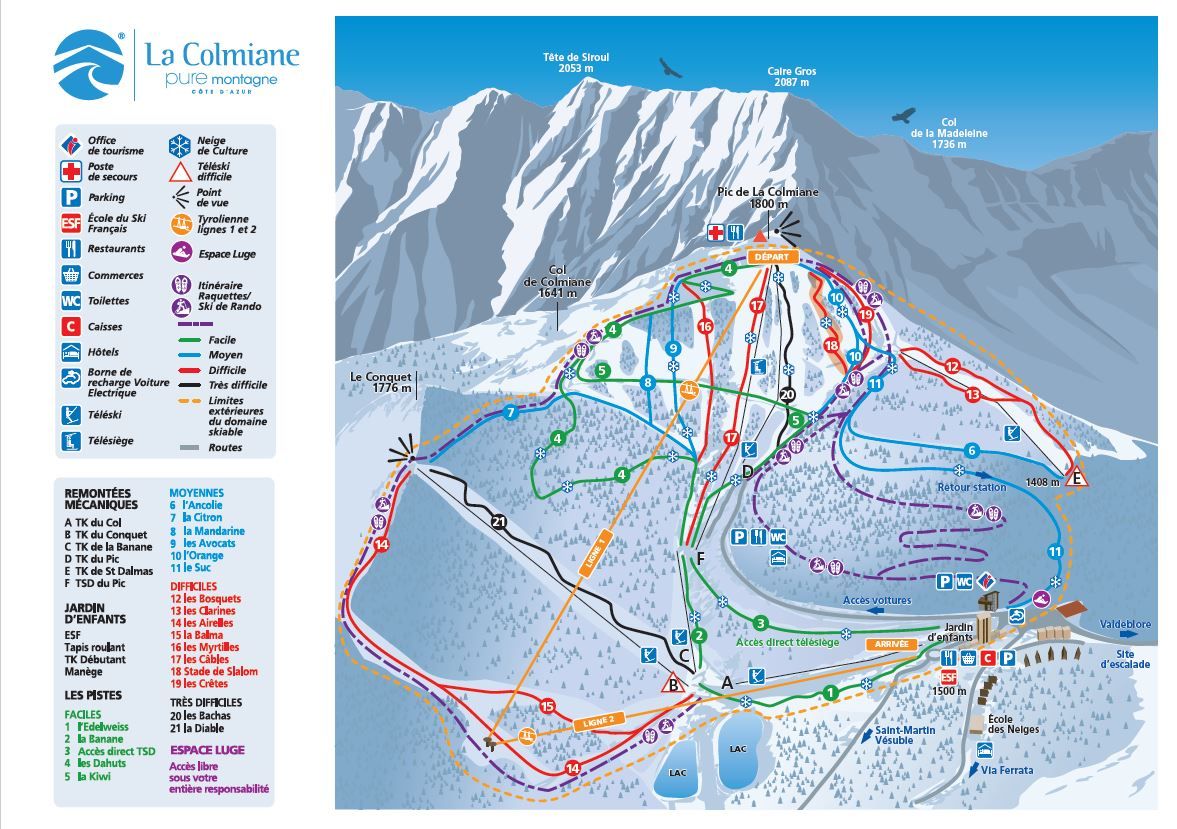 Located between 1400 and 1800 meters above sea level (summit of the Pic de la Colmiane); the ski area of La Colmiane represents 30 kilometers of ski slopes served by 6 ski lifts including 1 chairlift. 21 runs in total meander between steep slopes, more hilly passages and flat areas ideal for learning to ski.