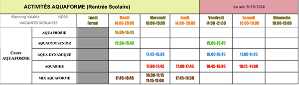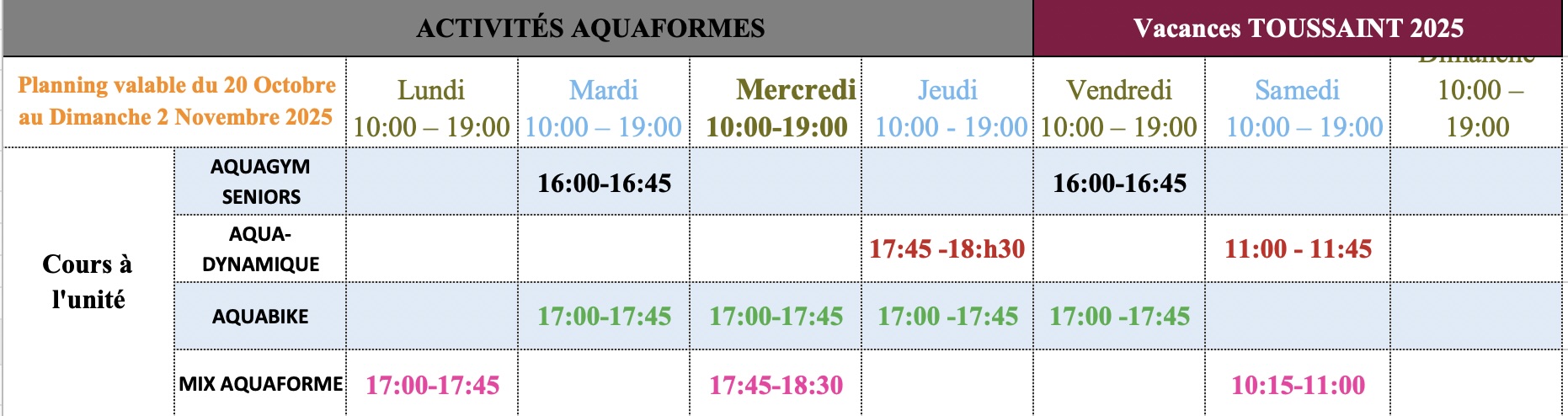 Aqua-tonique : aquagym variée mêlant différents exercices à intensité modérée. L’ensemble du corps est sollicité. Idéal pour les séniors ou reprise d’exercice notamment